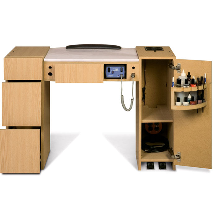 Classic Nail Table is a must-have for any salon and spa. Make sure your customers receive the best services by equipping your business with the finest manicure tables in the beauty industry. Our popular Classic manicure tables are designed for salons that want functionality with luxury. Each table is equipped with special features and convenient extras, like built-in fans, bottle organizers and trash bins. Our manicure tables are handcrafted by our expert carpenters using quality parts and components. Each table is custom-made and made-to-order with your choice of Oak, Mahogany, Cafelle, or White laminates. For quality assurance, each manicure table is designed and assembled here in the USA.