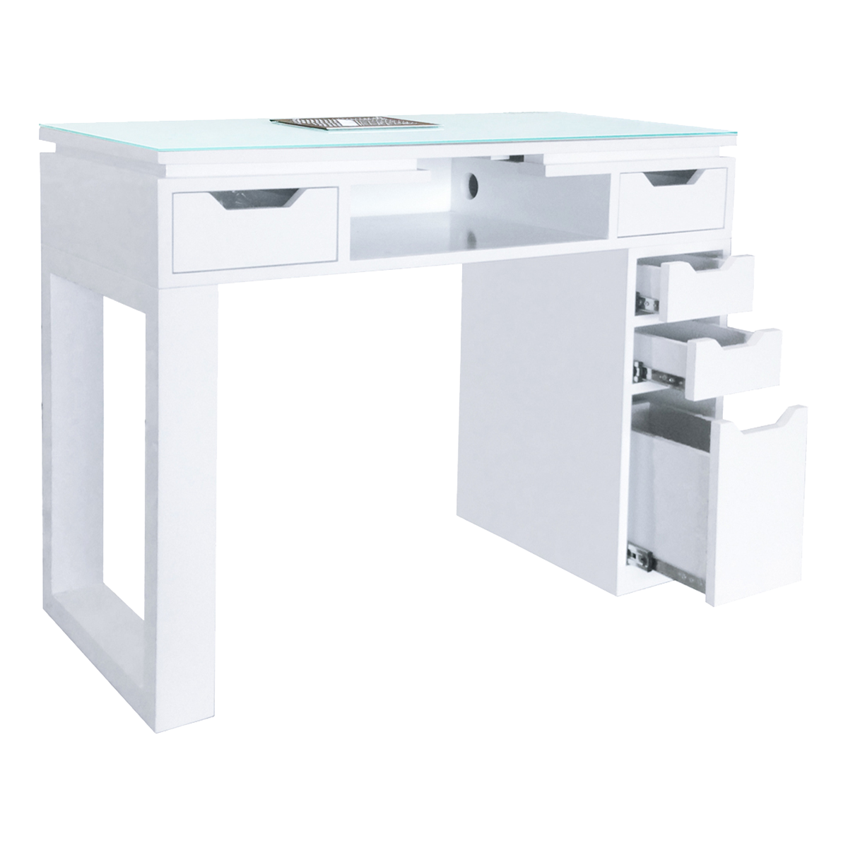 The Lux Nail Table features a streamlined, modern design perfect for professional nail and spa settings. Equipped with several drawers and compartments, it keeps your tools neatly organized. Its elegant high-gloss finish complements any environment, while built-in USB and AC outlets provide convenient power options. For added practicality, you can include the Valentino flush mount to support a ventilation fan.