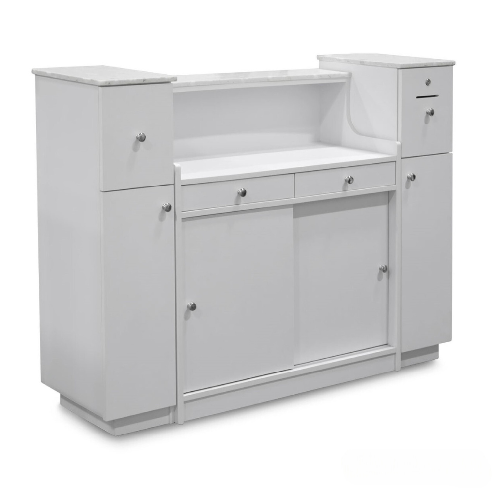 The luxurious Sonoma Reception Desk is a must-have for your high-end salon! Showcasing off white granite with beautiful shades of beige and grey, and complemented by a sleek brushed aluminum accent, this stunning desk is sure to make a statement. The 2" framed molding and adjustable glass shelves add an extra touch of elegance, allowing you to beautifully display your top products. Make a lasting impression with the Sonoma Reception w/ Glass Display.