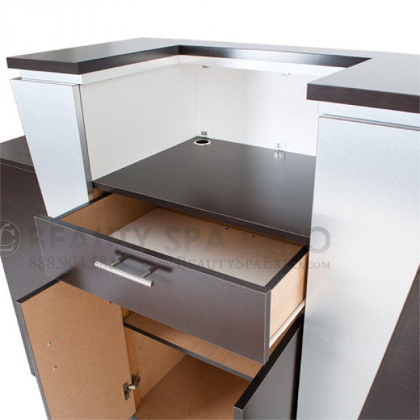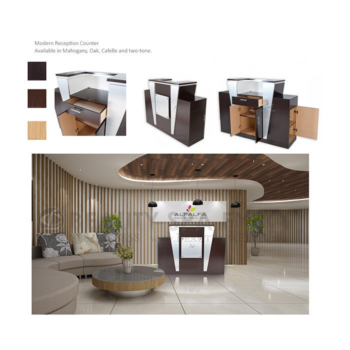 This stylish reception counter can be custom made in your choice of laminate. Our popular choices are Cafelle, New Natural Oak, Mahogany, and White, with many other customized laminate colors available at customer’s request (subject to market and availability). When ordering, you can choose to add an (optional) acrylic sign holder and customized insert to prominently display a decorative poster or your current specials or business hours. The Voltron Reception Counter is finished with a stunning chrome inlay for a clean, sophisticated appearance Impress your customers with this stylish reception counter, designed with strong lines and modern flare
