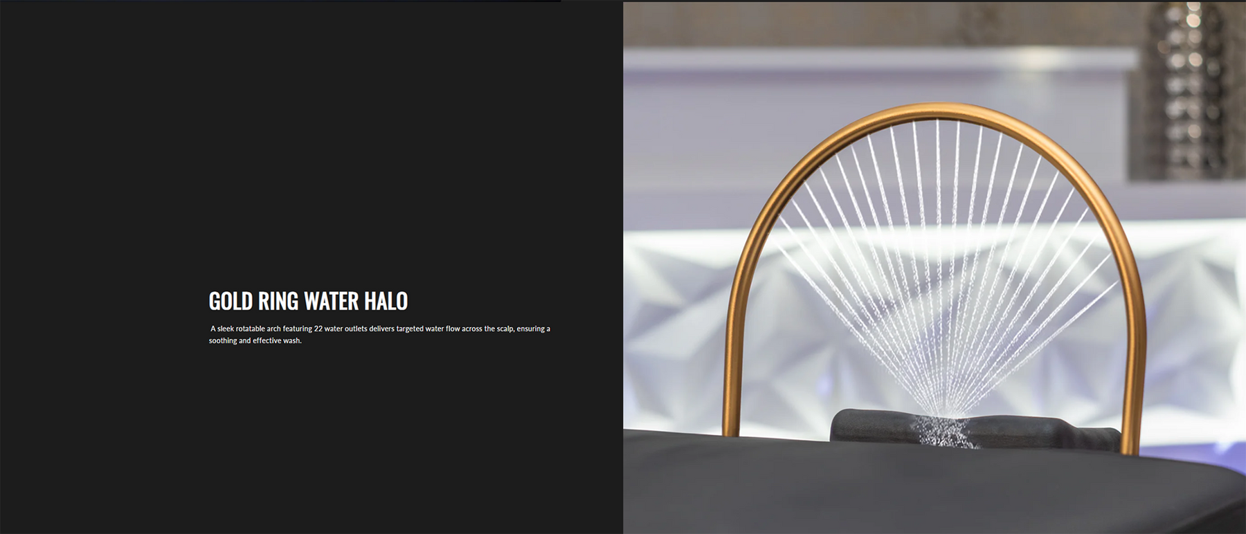 At the heart of this innovation is the Gold Ring Water Halo—a sleek, rotatable arch featuring 22 precision water outlets that provide even, targeted water flow across the scalp. It’s a soothing, spa-like cleanse that turns every shampoo service into a moment of indulgence.