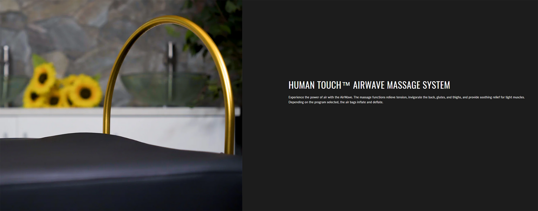 • Human Touch™ AirWave AirWave Massage System – Experience the power of air with the AirWave. The massage functions relieve tension, invigorate the back, glutes, and thighs, and provide soothing relief for tight muscles. Depending on the program selected, the air bags inflate and deflate.