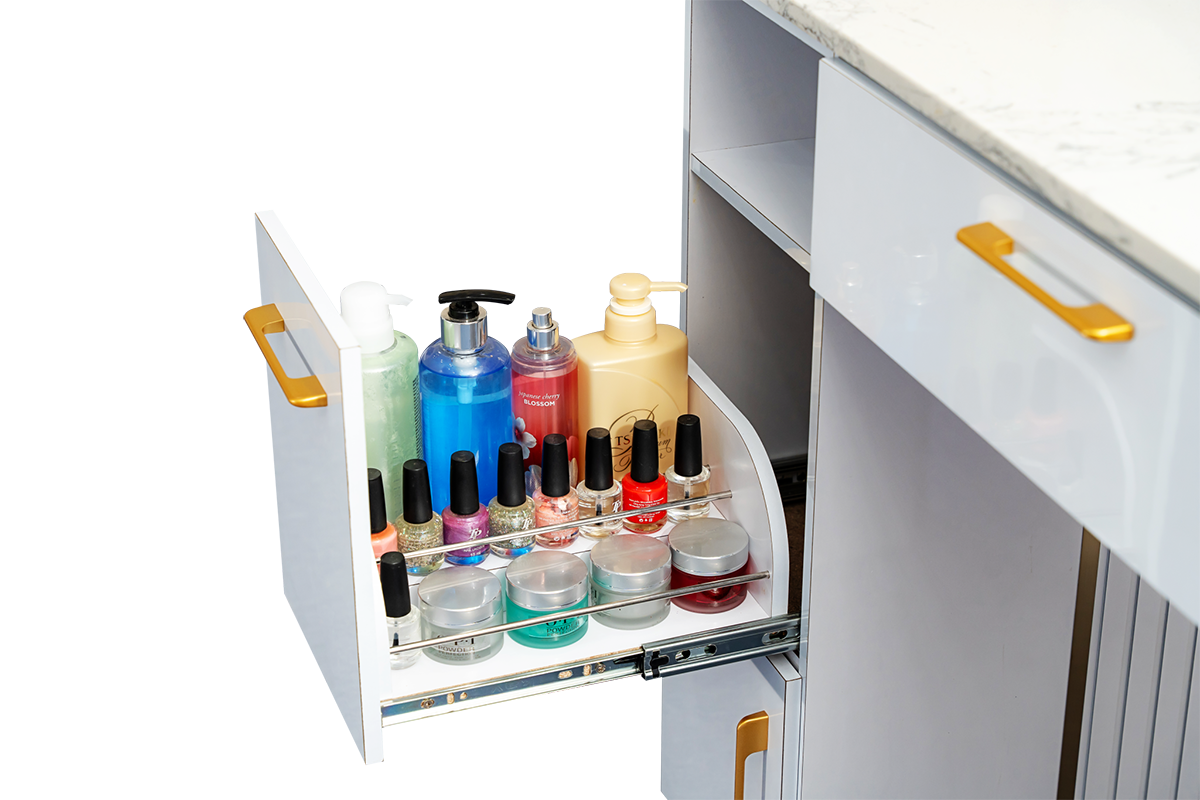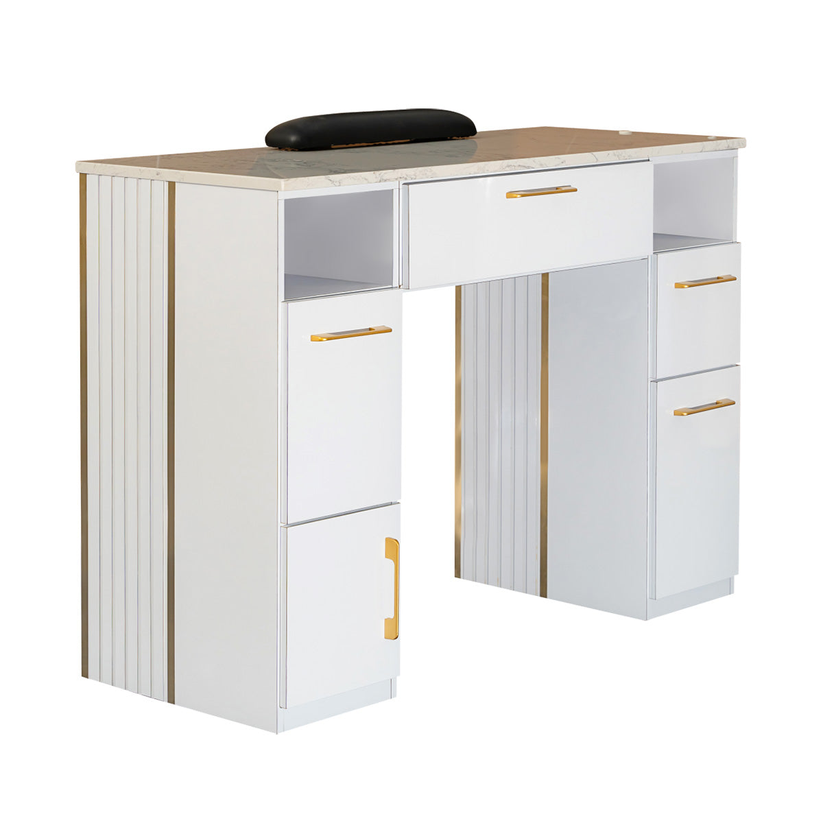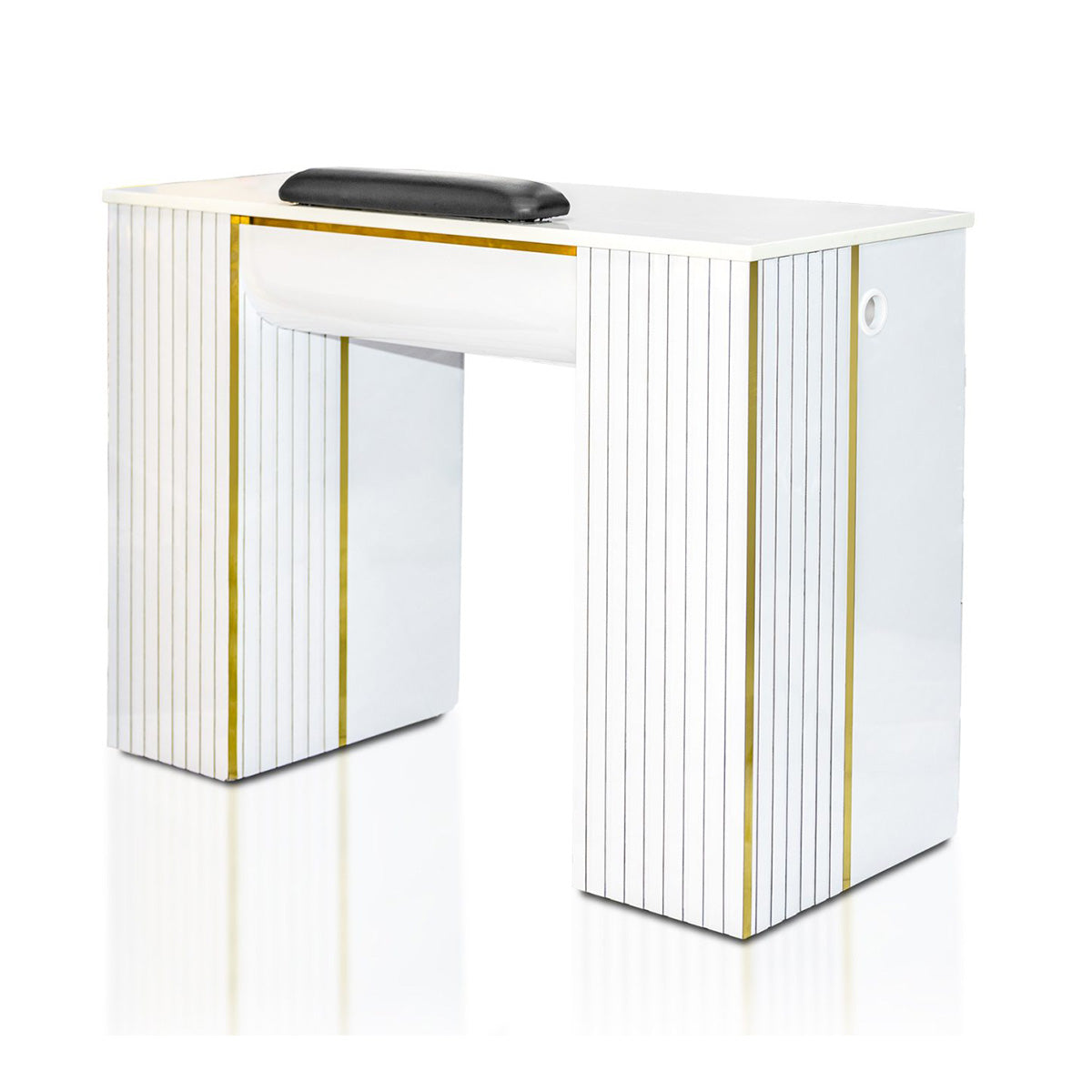 The Le Cinq Single Nail Table brings elegance and functionality together with its stunning white finish, highlighted by gold trim accents. The marble countertop adds a luxurious touch while providing a durable workspace. Designed with convenience in mind, the table includes a built-in trash bin, an electrical outlet, and a comfortable handrest. Its standout feature is the eye-catching vertical lines on the front display, accented by the gold trim, adding a bold and sophisticated look that will enhance any salon’s aesthetic.
