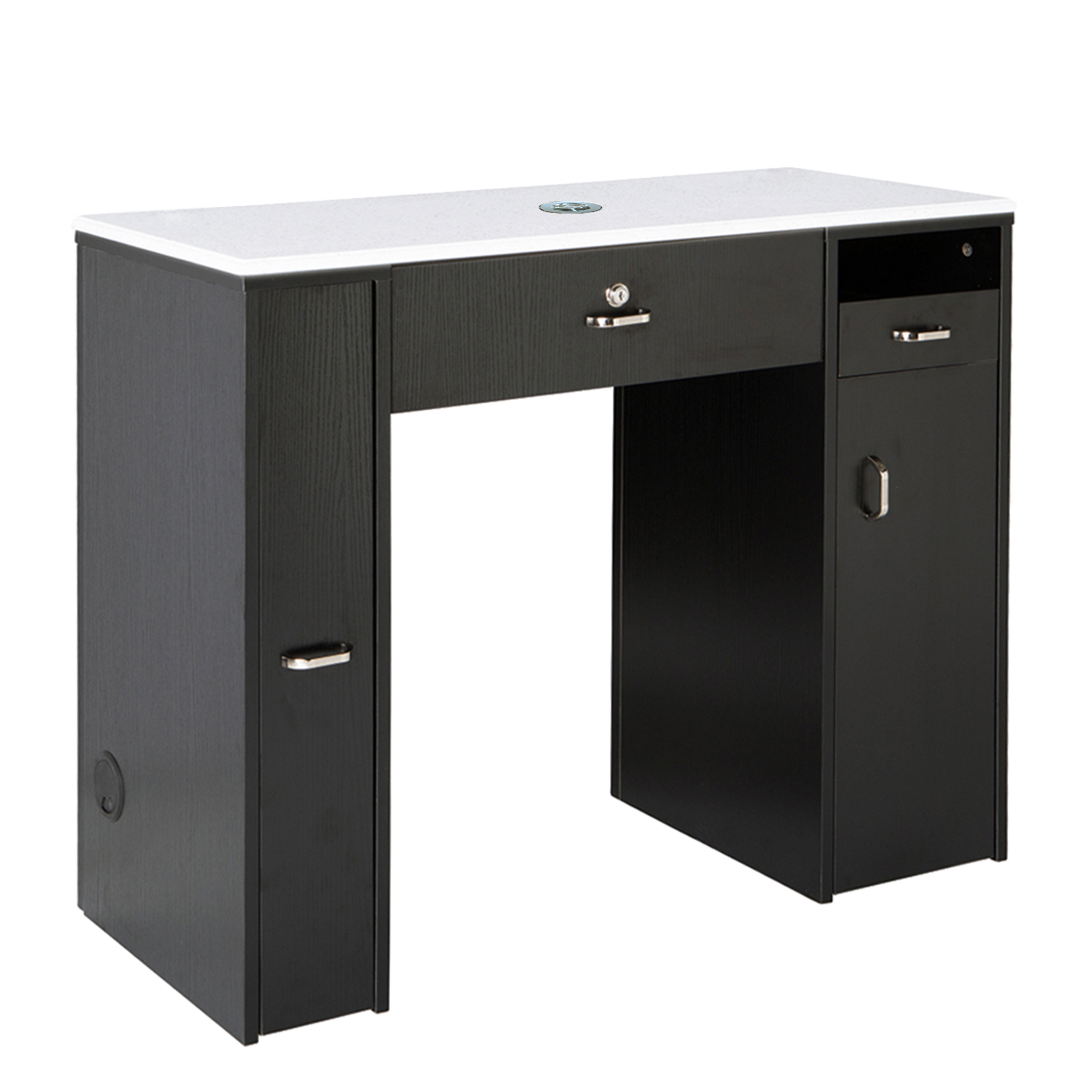 NM 901 nail table offers you everything you could want in a manicure table with your choice of three colors: Black, Gray and White. While the NM 901 manicure table is certainly beautiful with its linear framework and contrasting inlays of white, beauty is not the only reason to purchase this great manicure table. The NM 901 nail station also has everything you could possible want for your manicure technicians. The beautiful solid work surface includes plenty of space for all necessary work items and the multiple openings allow easy organization of power cords and other work tools. The wide knee well provides comfortable seating for both the client and the manicure technicians. The NM 901 is everything you need in a beautiful, functional manicure table with stylish options to blend with your existing spa or salon décor.