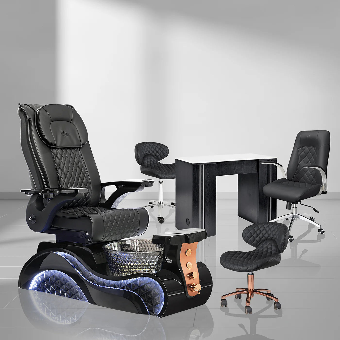 To complete the look and feel of luxury, the package also includes a coordinated set of high-end essentials: a designer nail table, a plush customer chair, an ergonomic technician chair, and a sleek pedicure stool—all included at no extra cost.