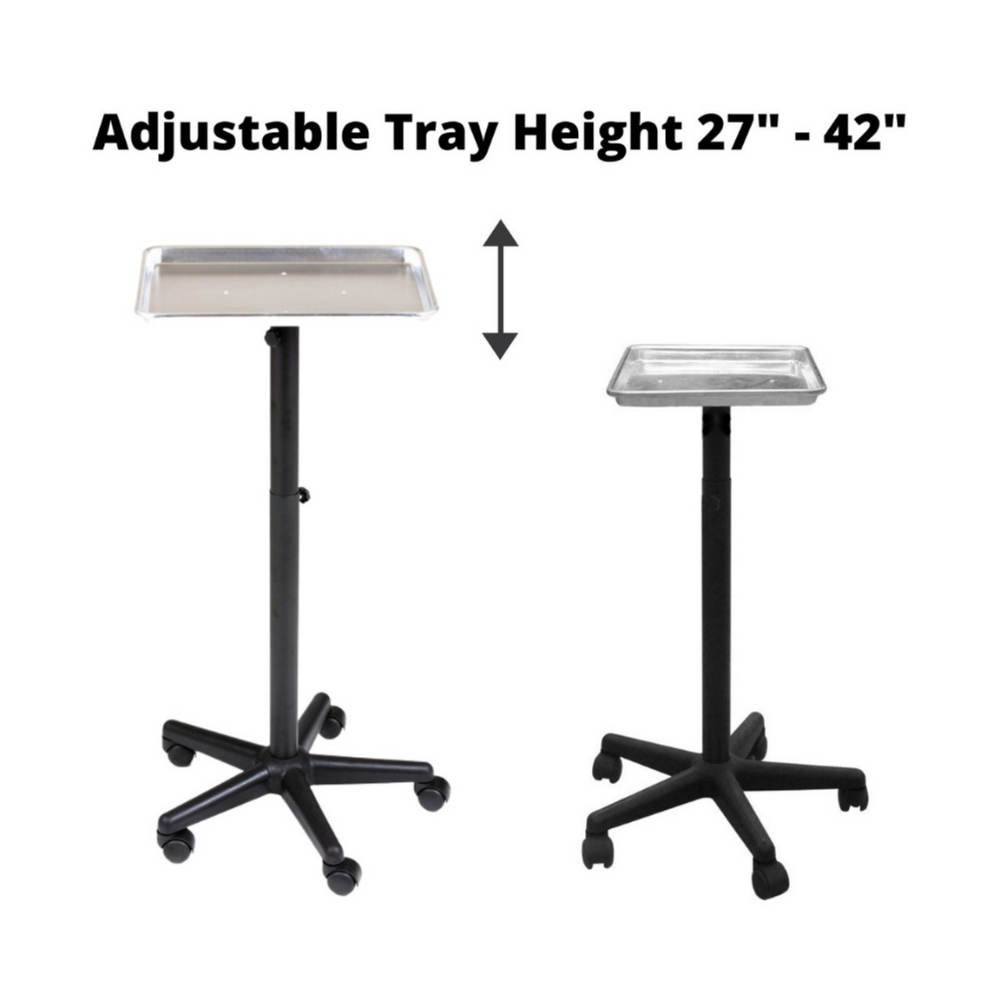 Transform and elevate your salon experience with this amazing aluminum service tray! Its smooth, stain-resistant surface and sturdy black stand make it a breeze to clean and move around. Plus, with its wide base and low center of gravity, you'll never have to worry about any tipping accidents. Get yours today and take your salon to the next level!